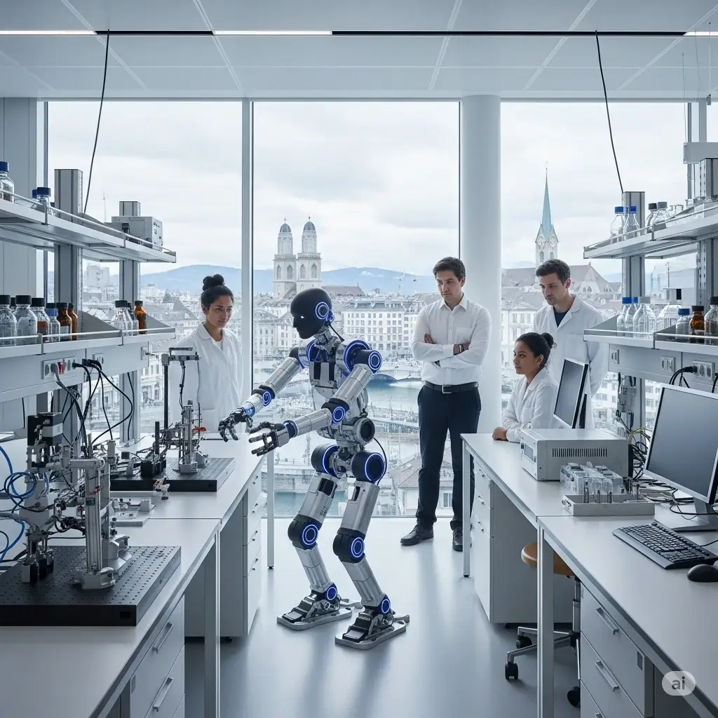 Scientists and a person analyzing a robot in a highly advanced lab with a spectacular view of University of Zurich, Zurich, Switzerland, researching DNA-based nutrition and its role in reducing chronic disease risk.