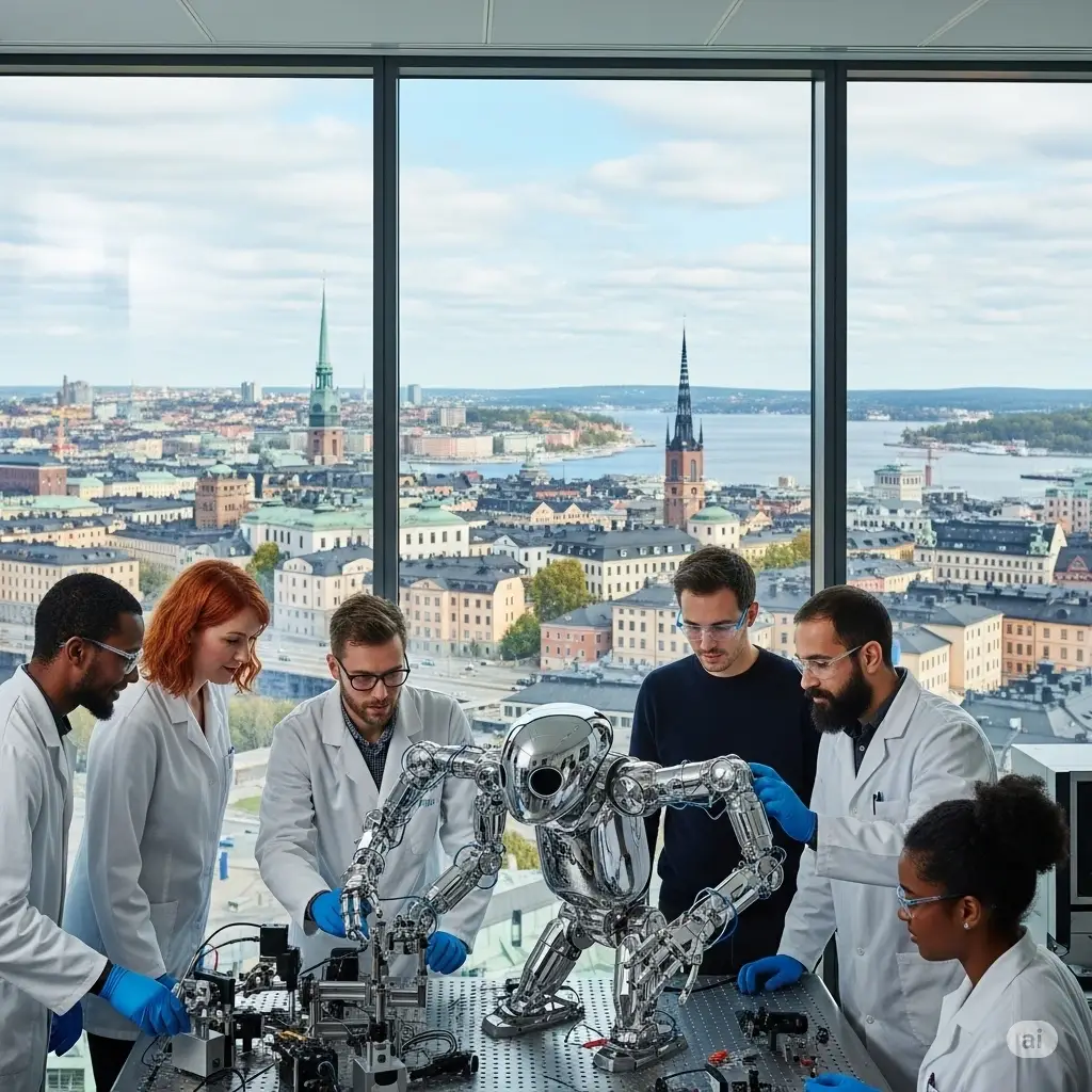 Scientists and a person analyzing a robot in a highly advanced laboratory with a spectacular view of Stockholm, Sweden, working in monitoring health and making changes based on DNA-based nutrition to better understand genetics’ influence on nutrition.