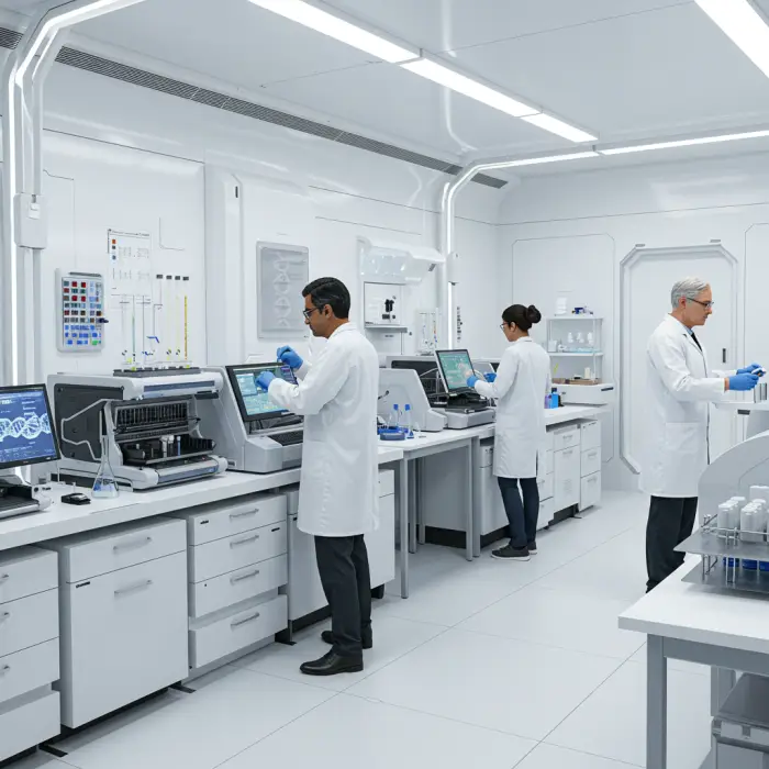Top-tier, state-of-the-art laboratory where scientists use cutting-edge robotic devices to conduct advanced research on human genetics related to mental health and stress. The team investigates how DNA influences susceptibility to anxiety and depression to create personalized strategies for mental wellness.